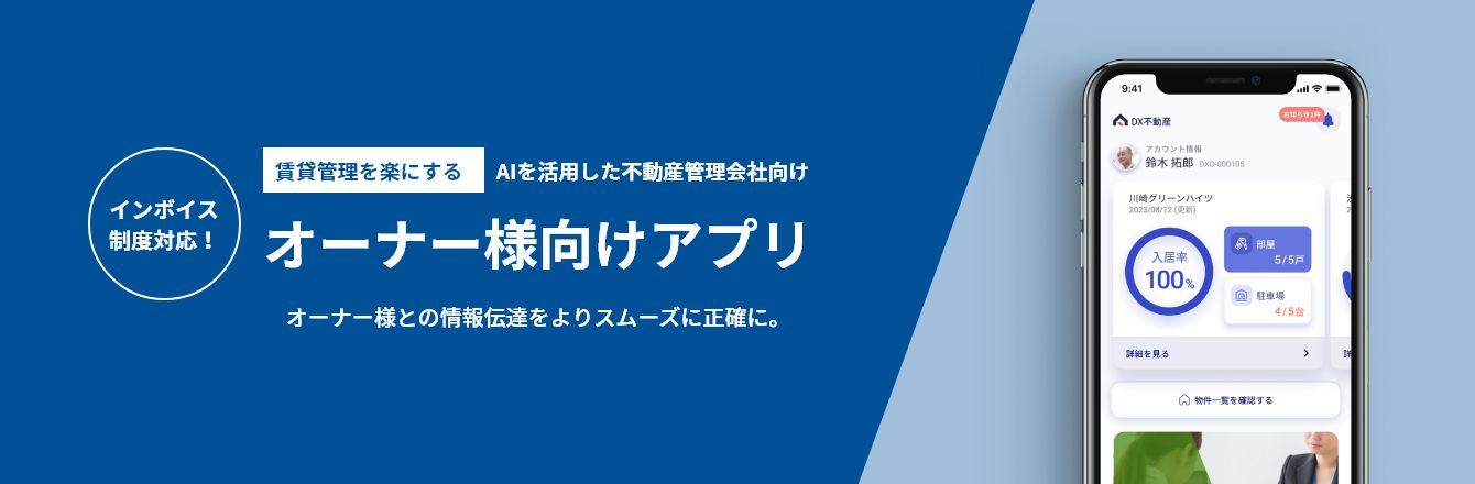 弊社が導入している「GMO賃貸DXオーナーアプリ」は、オーナー様と管理会社間のコミュニケーションを、ご利用のスマートフォンやパソコンのブラウザ上で一元管理できるアプリになります。郵送される紙の報告書や見積書、設備修理の確認電話・収支報告書を添付したメールなど、様々な方法でやり取りされてきたものが、GMO賃貸DXオーナーアプリのみで完結するようになります。アプリでは、各物件の入居率や物件情報、管理会社からの各種報告、月次収支報告書や年次収支報告書のダウンロードまで可能。管理会社担当者とのやりとりはチャット形式でいつでも可能です。